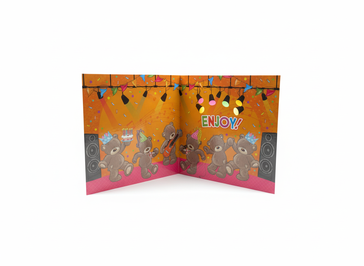 🐻 Entzückendes Design: Auf der Vorderseite tanzt ein süßer Teddybär mit Kopfhörern zwischen bunten Ballons. Im Inneren geht die Party weiter: Eine ganze Crew von Bären mit Partyhüten feiert ausgelassen und ist bereit, den Kuchen anzuschneiden – alles vor einer coolen, von Discolichtern beleuchteten Kulisse.